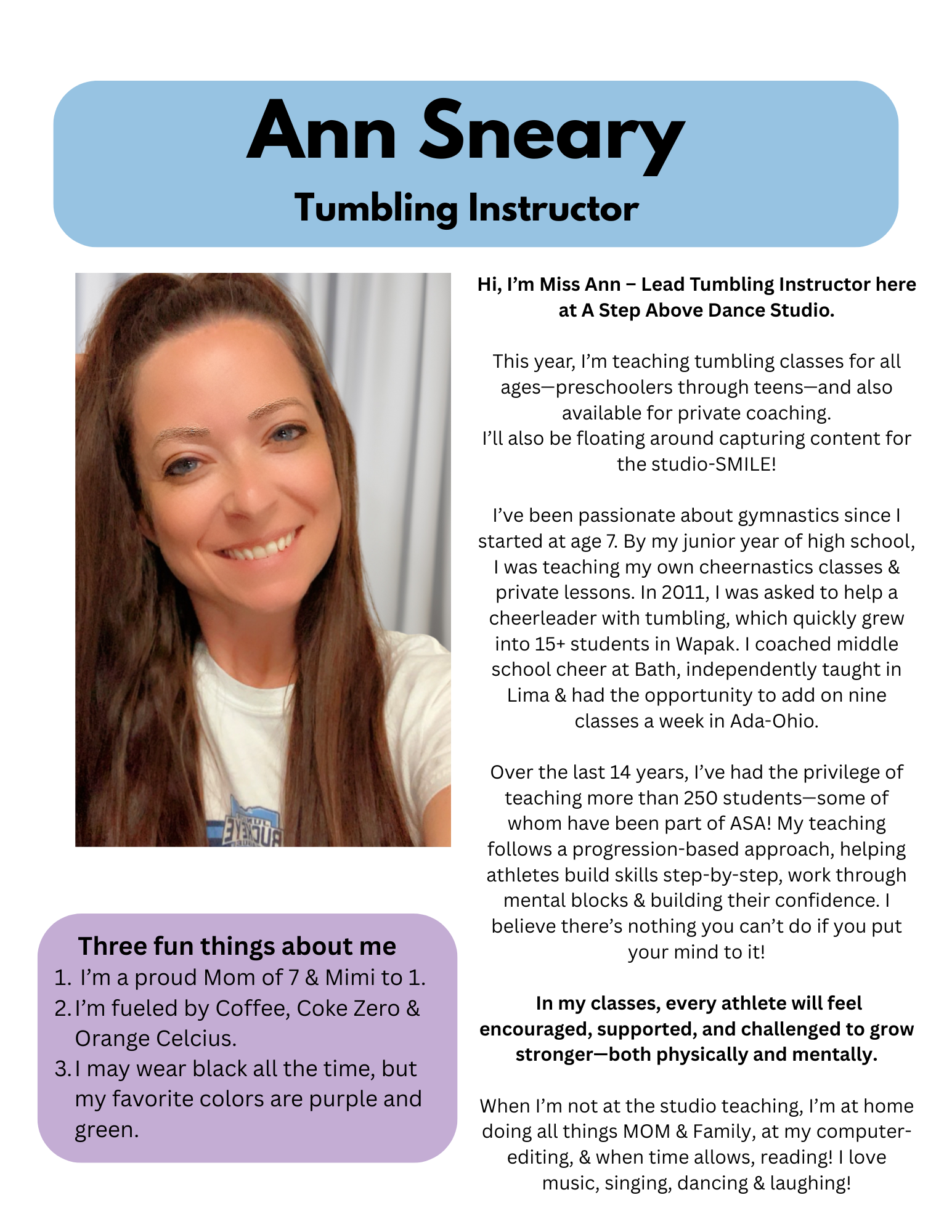 Ann Sneary, Tumble Instructor