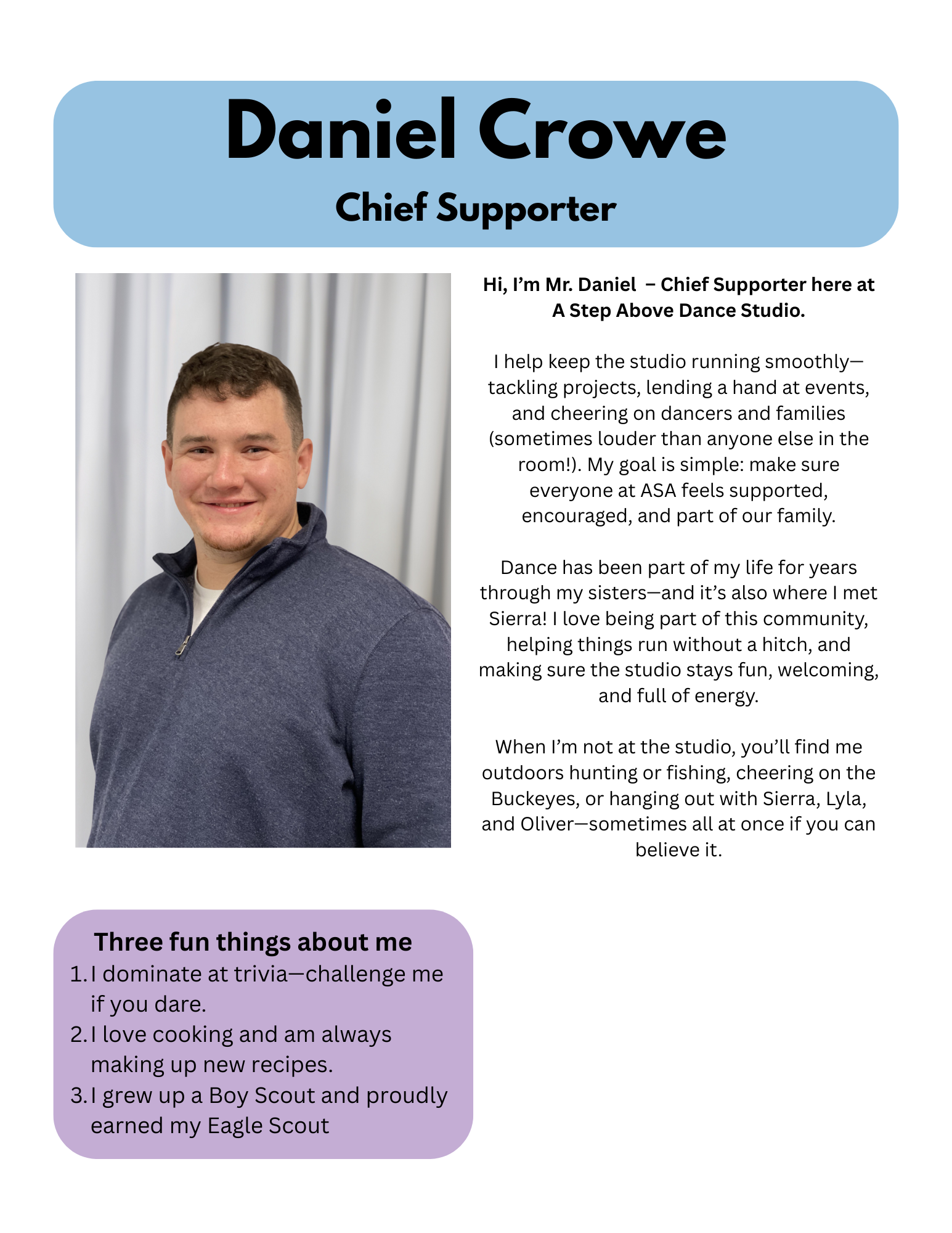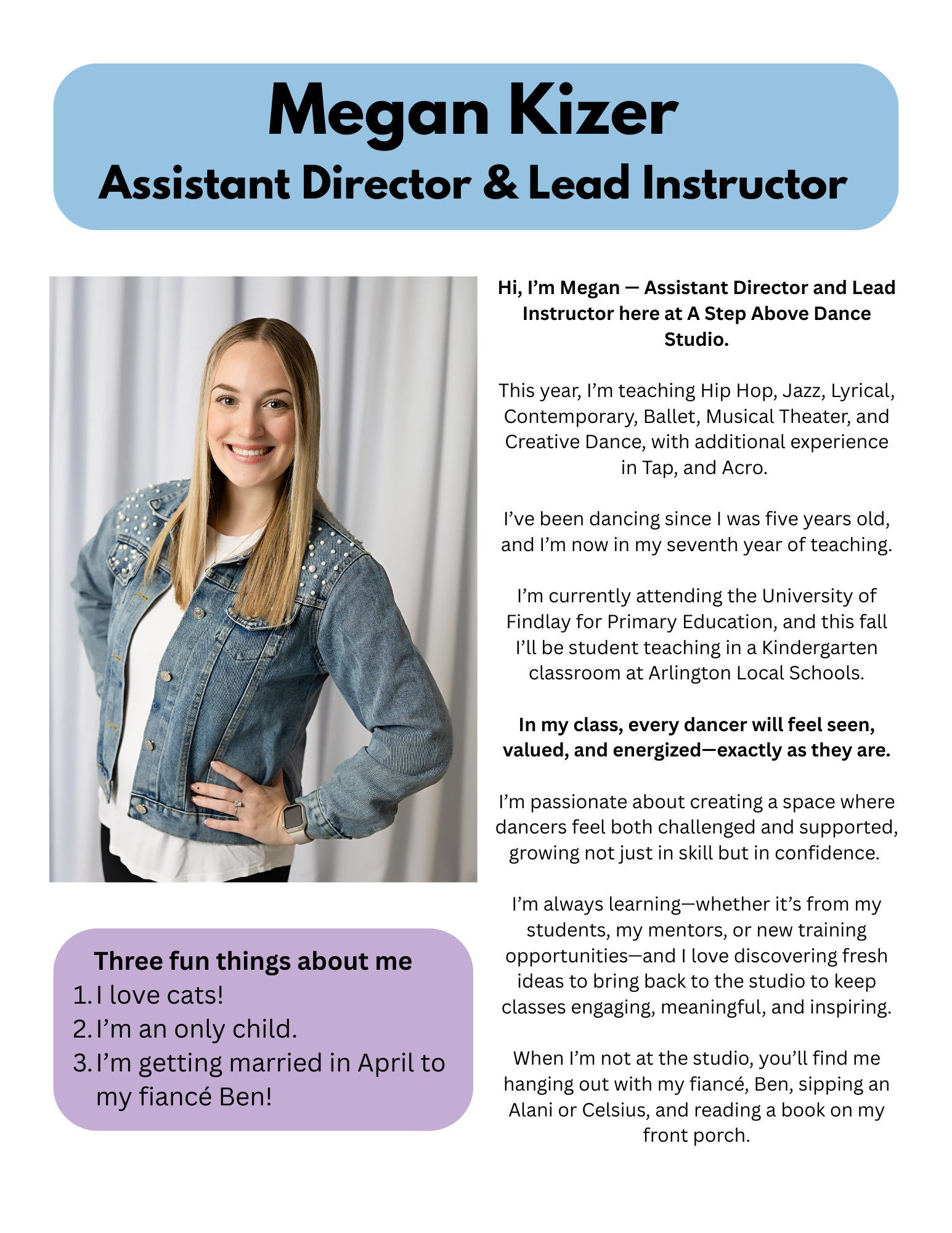 Located near downtown Lima, OH, A Step Above boasts two dynamic studio rooms and a variety of 9 dance styles for ages 18 months to 18 years. Whether your child dreams of becoming a pro, wants to stay active, or is just discovering dance, they belong here. Our experienced teachers come from diverse backgrounds, all sharing a deep passion for dance and a dedication to supporting each student. Join group classes or snag private lessons tailored to your schedule.